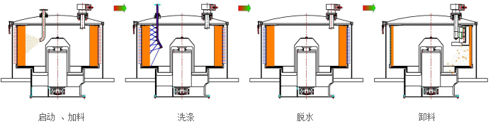 電機(jī)帶動皮帶輪驅(qū)動轉(zhuǎn)鼓繞自身軸線高速回轉(zhuǎn),物料在預(yù)先編制的程序控制下,通過進(jìn)料系統(tǒng)進(jìn)入高速旋轉(zhuǎn)的轉(zhuǎn)鼓內(nèi)。在離心力的作用下,物料均布在過濾介質(zhì)上進(jìn)行脫液分離,液相透過固相物料和濾網(wǎng)縫隙,經(jīng)鼓壁孔甩至機(jī)殼空間,從出液口排出機(jī)外,固相物料截留在轉(zhuǎn)鼓內(nèi)形成濾餅。料層檢測裝置實時檢測物料的充填位置,當(dāng)濾餅達(dá)到事先設(shè)定的位置時,自動關(guān)閉加料閥,停止進(jìn)料,然后對濾餅進(jìn)行洗滌、脫水,待達(dá)到要求后,離心機(jī)降到卸料速度,刮料器在液(氣)動控制下將濾餅刮下,經(jīng)轉(zhuǎn)鼓底上的出料口卸出。