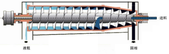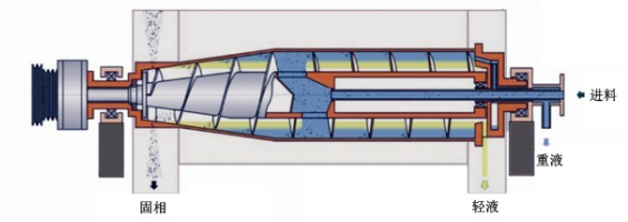 主機(jī)啟動(dòng)達(dá)到加料轉(zhuǎn)速,進(jìn)料閥打開懸浮液連續(xù)進(jìn)入機(jī)內(nèi),經(jīng)螺旋輸送器的內(nèi)筒出料口進(jìn)入轉(zhuǎn)鼓內(nèi),在離心力的作用下,懸浮液在轉(zhuǎn)鼓內(nèi)形成一環(huán)形液流,固體顆粒在離心力的作用下沉降到轉(zhuǎn)鼓內(nèi)壁上,由于差速器的差動(dòng)作用使螺旋輸送器與轉(zhuǎn)鼓之間形成相對(duì)運(yùn)動(dòng),沉渣被螺旋推送到轉(zhuǎn)鼓小端的干燥區(qū)進(jìn)一步脫水,然后經(jīng)出渣口排出。液相形成一個(gè)內(nèi)環(huán),不斷的經(jīng)轉(zhuǎn)鼓大端溢流孔排出。如液相是含有輕、重兩相的乳濁液,由于比重不同,形成輕、重兩液環(huán),從轉(zhuǎn)鼓大端排出機(jī)外。